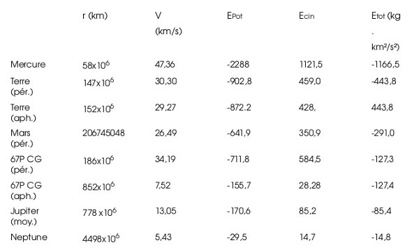 Conclusion : lorsqu’on s’éloigne du Soleil, l’énergie cinétique diminue mais l’énergie potentielle augmente encore plus rapidement (elle devient de moins en moins négative). Résultat, un kilogramme en orbite loin du soleil a une énergie totale plus élevée que s’il est près de celui-ci. Ceci signifie également qu’il faut moins d’énergie pour l’extraire de l’attraction du Soleil s’il est situé plus loin de ce dernier. Le signe négatif de l’énergie totale indique en effet qu’un corps en orbite autour du soleil reste encore soumis, par définition, à son attraction. Pour le libérer de cette attraction, il faudrait lui communiquer une énergie cinétique correspondant au moins à son énergie potentiel, de sorte que son niveau d’énergie totale puisse être supérieur à zéro. Ainsi, selon notre tableau, l’orbite de 67P GC est à un niveau énergétique 3,48 fois plus élevé que celui de l’orbite de la Terre (443,8/127,3) et plus de deux fois celui de l’orbite de Mars. On voit également que l’énergie cinétique est compensée par l’énergie potentielle lorsqu’on se déplace sur une même orbite, entre le périhélie et l’aphélie. Voir exemples de la Terre, de Mars et de la comète 67P CG (Tchourioumov-Gerasimenko). |