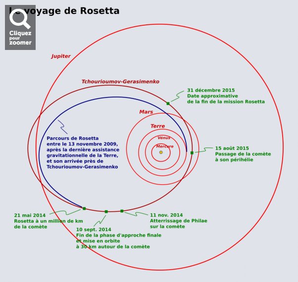 Les comètes ont, tout au long de l’histoire humaine, fasciné. La première comète périodique connue de l’humanité, la comète de Halley, a été répertoriée il y a bien longtemps dans les agendas astronomiques babyloniens. Dans les chroniques de l’ère des Royaumes combattants (203-221 B.C.) en Chine, Halley était considérée comme annonciatrice de troubles à venir, et les Livres sibyllins romains disaient qu’elle serait un « signe de l’épée, la famine, la mort et la chute de puissants personnages et de grands peuples ». Son apparition au Ve siècle av. J.C. coïncida avec l’invasion d’Attila le Hun et au XIe siècle avec la conquête normande de l’Angleterre, événement vécu comme une calamité par le peuple anglais. Quoi qu’il en soit, les comètes restent un mystère pour une grande partie de la population. Une autre raison pour laquelle la mission soulève un intérêt particulier est liée aux questions scientifiques soulevées par l’interaction entre les comètes et les autres corps de notre système solaire. Un intérêt scientifique fondamental Les comètes sont la mémoire de notre système solaire, puisqu’elles n’ont pas beaucoup changé depuis sa formation, et ce en raison de leur grand éloignement du Soleil. Comme l’explique un scientifique français participant au projet, « notre système solaire serait au départ un nuage de gaz et de poussière, qui se serait effondré sur lui-même pour conduire à la formation d’un Soleil en son centre. Ce nuage se serait mis ensuite plus ou moins dans un plan, et en son sein se seraient formées les planètes et planétoïdes qui auraient servi de base à la formation des planètes. Lorsqu’ils étaient proches du soleil, ces planétoïdes auraient été constitués de matière solide, de silicates. La partie gazeuse, plus légère, des matériaux présents aurait pour sa part été ensuite balayée par les rayons de l’étoile naissante. » Ainsi, proche du Soleil, se formèrent des planétoïdes solides ou constitués de matière lourde, comme les astéroïdes, et plus on s’en éloigna, plus les corps devinrent légers, telles les comètes. Il existe probablement une continuité entre les deux, comme le montre la découverte récente de corps constitués à moitié de matière légère et à moitié de matière lourde. Ainsi, comme le précise ce scientifique, « plus les planétoïdes sont proches du Soleil, plus nombreux ils sont et plus facilement ils se rencontrent pour former des planètes. Pour les objets plus éloignés, comme ceux situés dans la ceinture de Kuyper par exemple, plus ils sont isolés et plus le phénomène d’accrétion se fait lentement, donnant naissance à de gros astéroïdes ou planétoïdes comme ceux que l’on retrouve dans cette ceinture ou dans ses alentours. » Il suffit ici de penser à l’exemple de Pluton ou d’Eris. Les comètes sont donc différentes des corps situés dans la ceinture s’étendant de Mars à Jupiter. Selon la loi de Titus-Bode, une planète aurait dû être présente à cet endroit. Si l’équivalent de la masse d’une planète dans cette région existe bel et bien, nous savons aujourd’hui qu’il ne s’agit pas d’une planète qui aurait explosé, mais plutôt d’une planète qui ne s’est jamais formée. Jupiter communique aux corps présents dans cette région une énergie qui les empêche de s’agglutiner pour former une planète. On pense aujourd’hui que Jupiter, première planète à s’être formée autour Soleil (avec un noyau solide correspondant au moins à la taille de la Terre) était à l’origine beaucoup plus proche de ce dernier et aurait migré vers l’extérieur de notre système solaire, avant que les rayons du Soleil ne deviennent suffisamment puissants pour chasser les gaz qu’elle avait accumulés autour d’elle. On pense également qu’elle a contrôlé d’une manière ou d’une autre au cours de sa migration le processus de formation de toutes les autres planètes aujourd’hui présentes. Avant la découverte des exoplanètes il y a dix ou quinze ans, on n’imaginait pas que des planètes aussi lourdes puissent se former aussi près des étoiles. Cette découverte bouleverse notre compréhension de la formation de notre propre système solaire et de l’histoire de Jupiter. Ainsi, la théorie de Victor Safronov sur le processus d’agrégation des corps solides comme processus ayant conduit à la formation du système solaire, émise à la fin des années soixante, se voit aujourd’hui validée par les observations dans d’autres systèmes solaires en formation : le phénomène d’accrétion est par conséquent le système de base de la formation des planètes. Pour résumer : la ceinture d’astéroïdes entre Mars et Jupiter est contenue par les résonances de la planète Jupiter. La ceinture de Kuyper, formée d’astéroïdes et de planétoïdes et qui démarre à partir de l’orbite d’Uranus et qui s’étend bien au-delà de Pluton, est moins clairement circonscrite pour ce qui concerne son extrémité extérieure, sauf qu’elle reste assez nettement située dans le plan de l’écliptique, toute comme la ceinture d’astéroïdes. Ceci n’est toutefois pas le cas du Nuage de Oorts, constitué de corps légers comme les comètes, qui lui est en trois dimensions, enveloppant notre système solaire d’une couche de milliers d’unités astronomiques d’épaisseur. (Une unité astronomique est égale à la distance de la Terre au Soleil, soit 150 millions de km environ.) L’origine de la vie Les comète auraient-elles pu amener sur Terre à une certaine époque l’eau et les composés organiques complexes pouvant être à l’origine de la vie ? C’est ce qu’espère éclaircir la mission Rosetta, en posant pour la toute première fois un atterrisseur sur la surface d’une comète, en l’occurrence Tchourioumov-Gerasimenko. On considère aujourd’hui que 80 % de